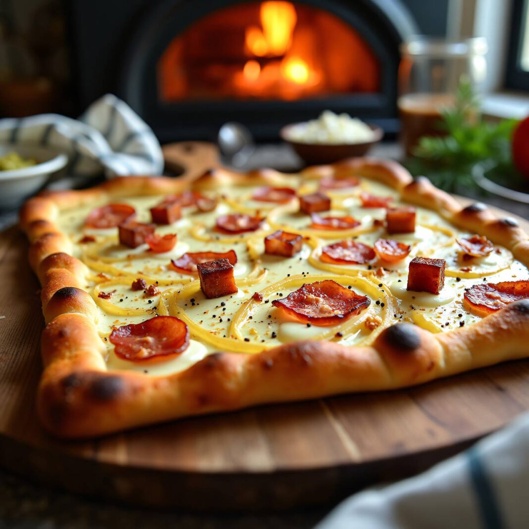 Ein schneller und einfacher Flammkuchen mit Crème fraîche, Zwiebeln und Speck.