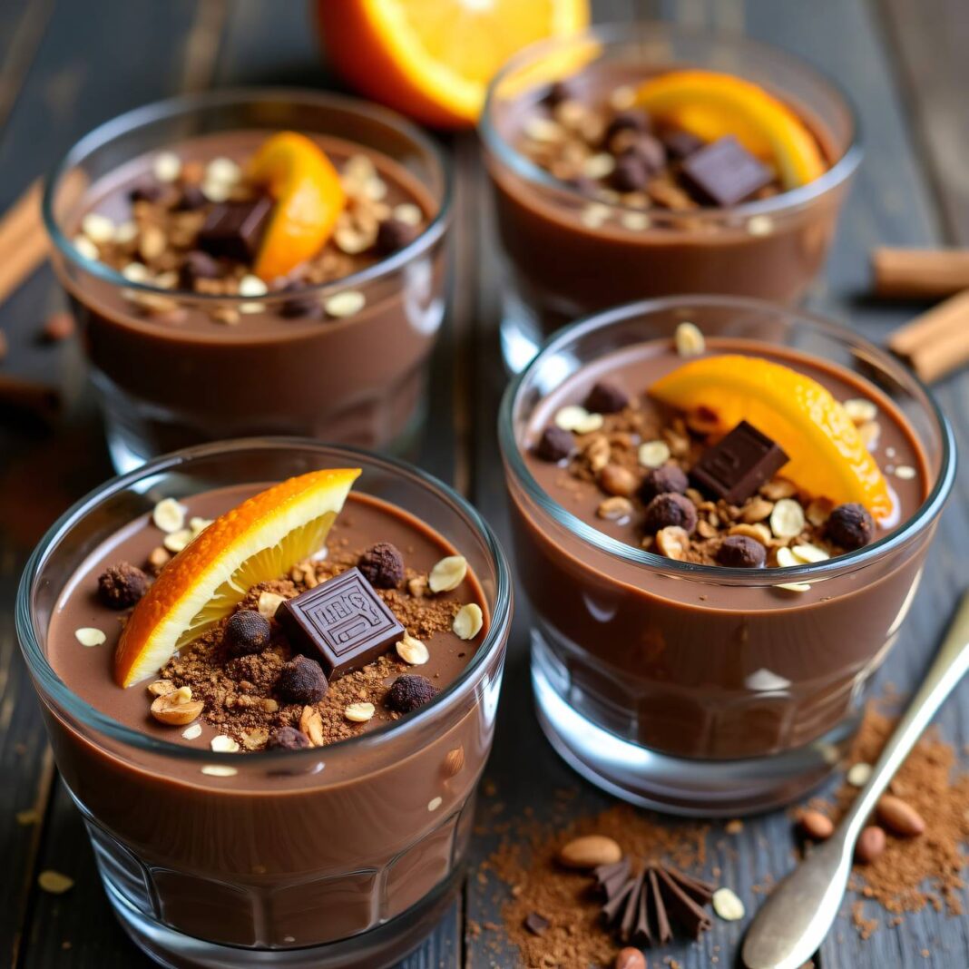 - Die Mischung in Gläser oder Schalen füllen und mit der gehackten Schokolade sowie dem Schokoladen-Joghurt anrichten.