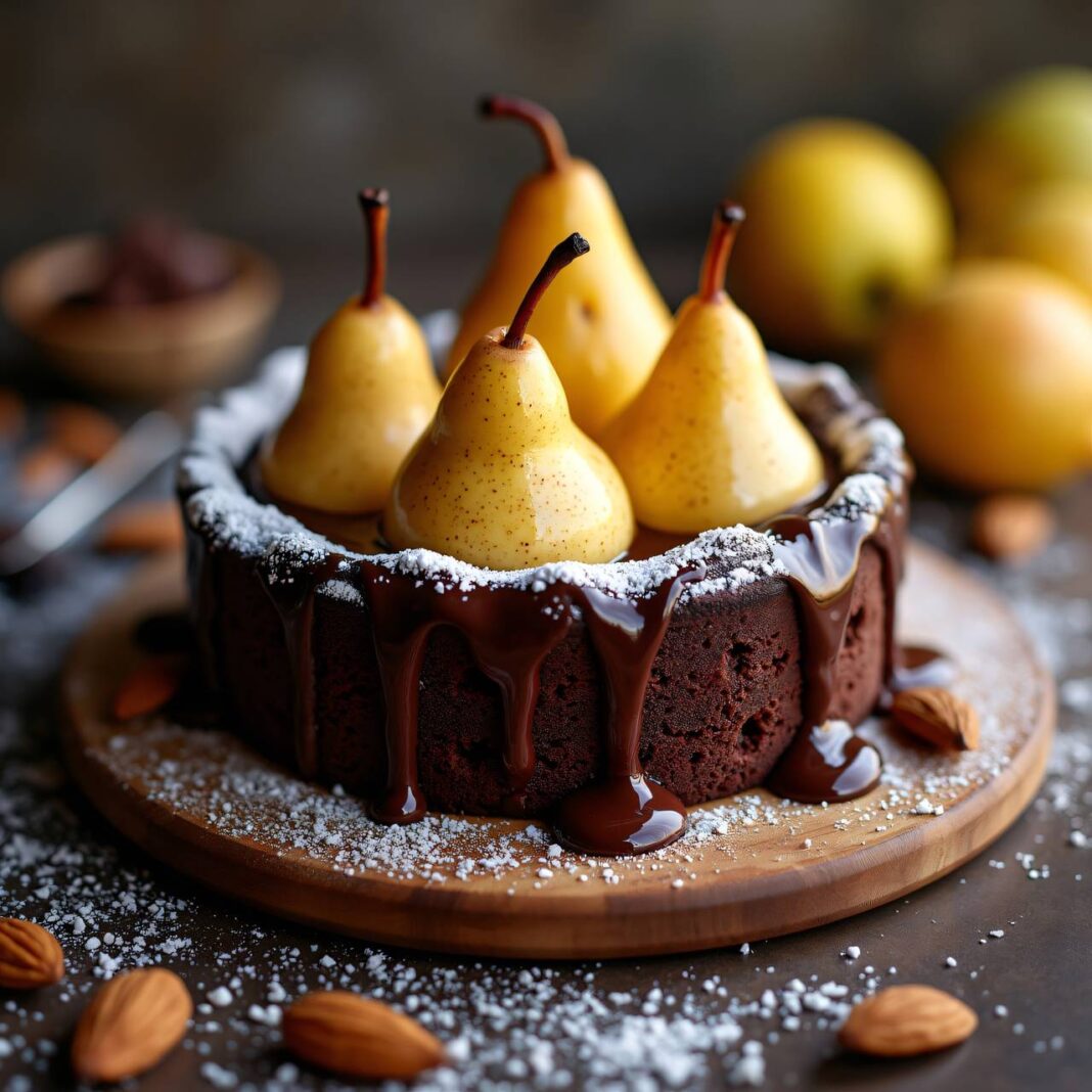 Ein köstlicher Schokoladenkuchen mit versunkenen Birnen, ideal für Schokoladenliebhaber.