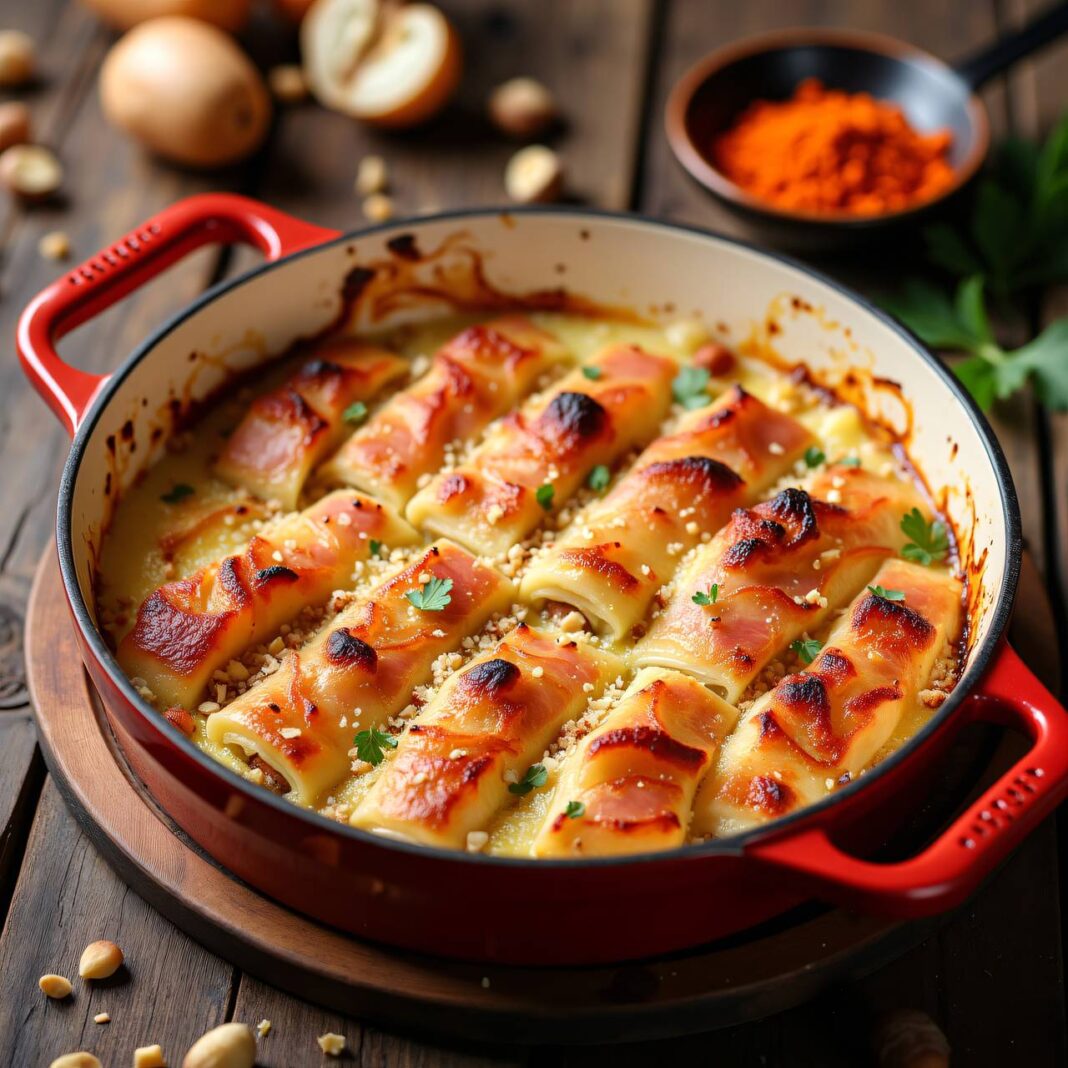 Ein köstliches Gratin aus Schwarzwurzeln, umwickelt mit Schinken und überbacken mit einer cremigen Sauce und geriebenem Bergkäse.