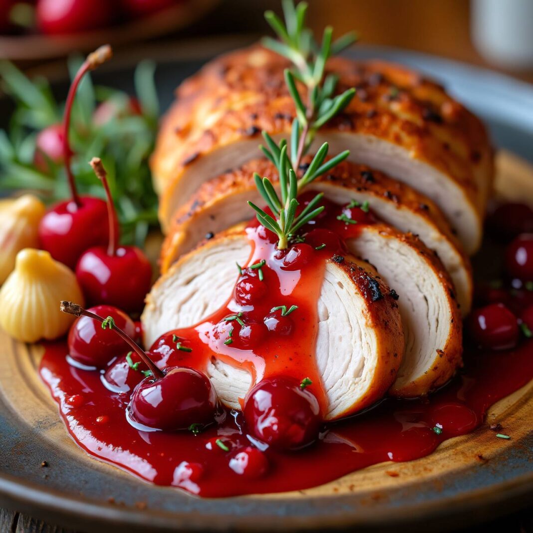 Ein saftiger Schweinsbraten, serviert mit einer köstlichen Kirschen-Schalotten-Sauce.