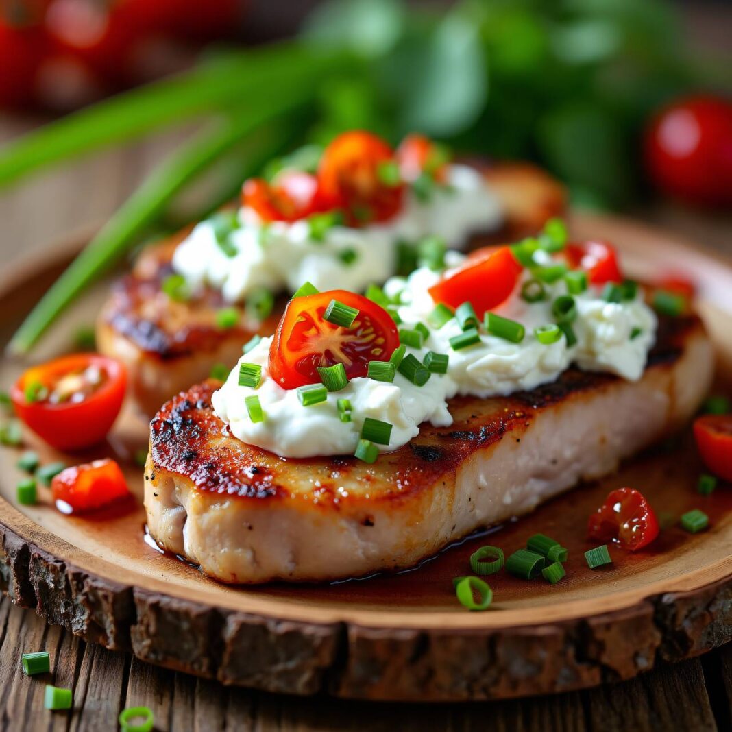 Saftige Schweinssteaks überbacken mit einer köstlichen Hüttenkäse-Haube.