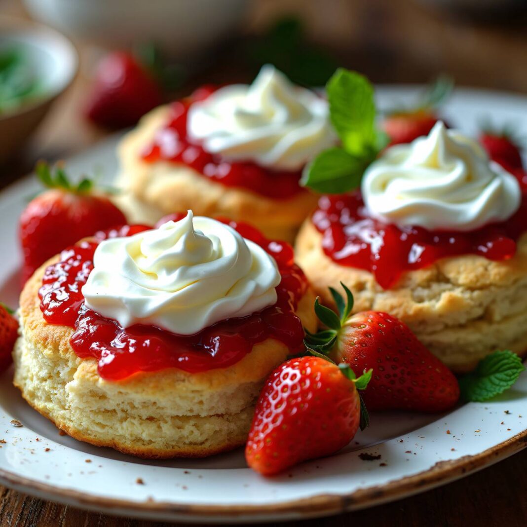 Genießen Sie frisch gebackene Scones mit Clotted Cream und Erdbeerkonfitüre, perfekt für eine Teestunde.