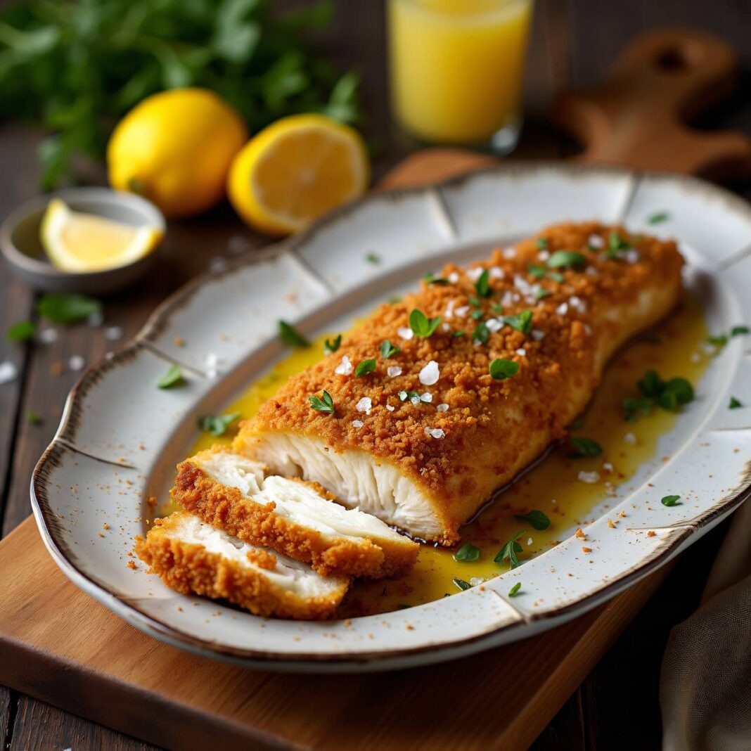 Ein köstliches Rezept für Seeteufelfilet, paniert und goldbraun gebraten, ideal zum Servieren mit frischem Zitronensaft.