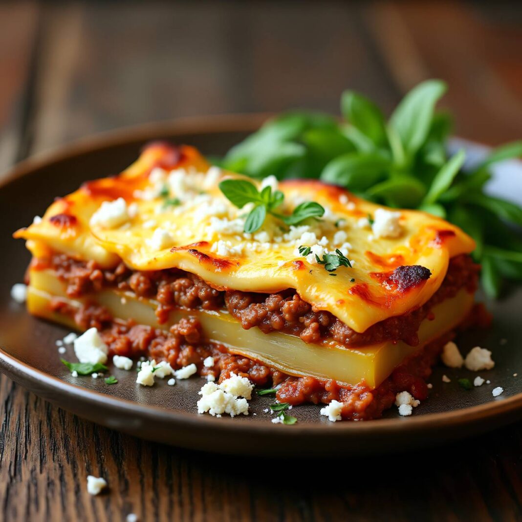 Eine köstliche Sellerie-Moussaka mit einer herzhaften Hackfleischsauce und cremigem Guss.