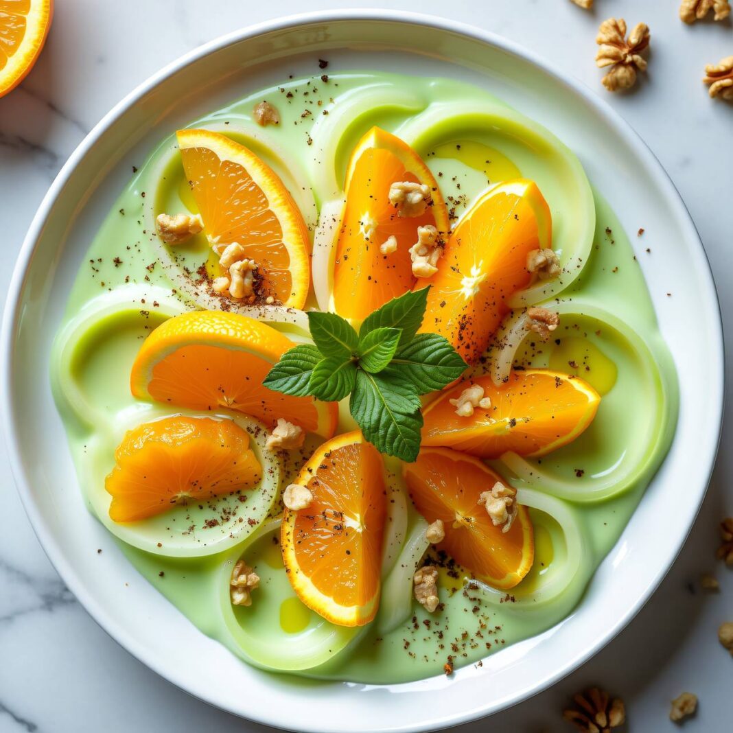 Ein erfrischendes Carpaccio aus Knollensellerie und Orangen, serviert mit einer cremigen Koriander-Sauermilch.
