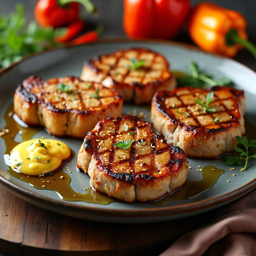 Leckere Schweinskoteletts, mariniert mit Senfkörnern und serviert mit einer cremigen Senfbutter.