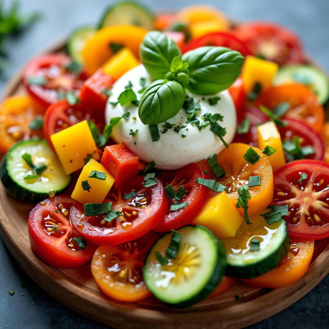 - Gemüse anrichten: Tomaten- und Zucchinischeiben fächerartig auf Tellern anordnen. Die gewürfelten Paprikastücke gleichmäßig darüber verteilen.