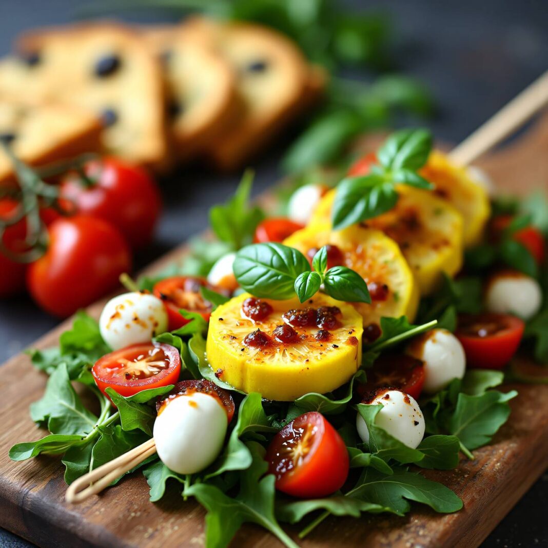 - Die Spießchen auf dem Rucola anrichten.