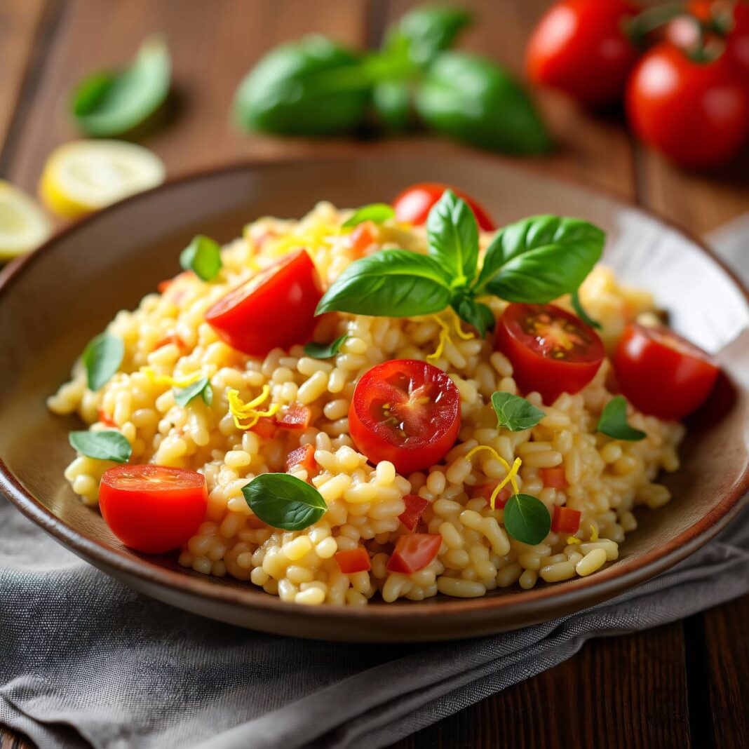 Ein leckeres und cremiges Risotto mit frischen Cherrytomaten und aromatischem Pesto, perfekt für den Sommer.