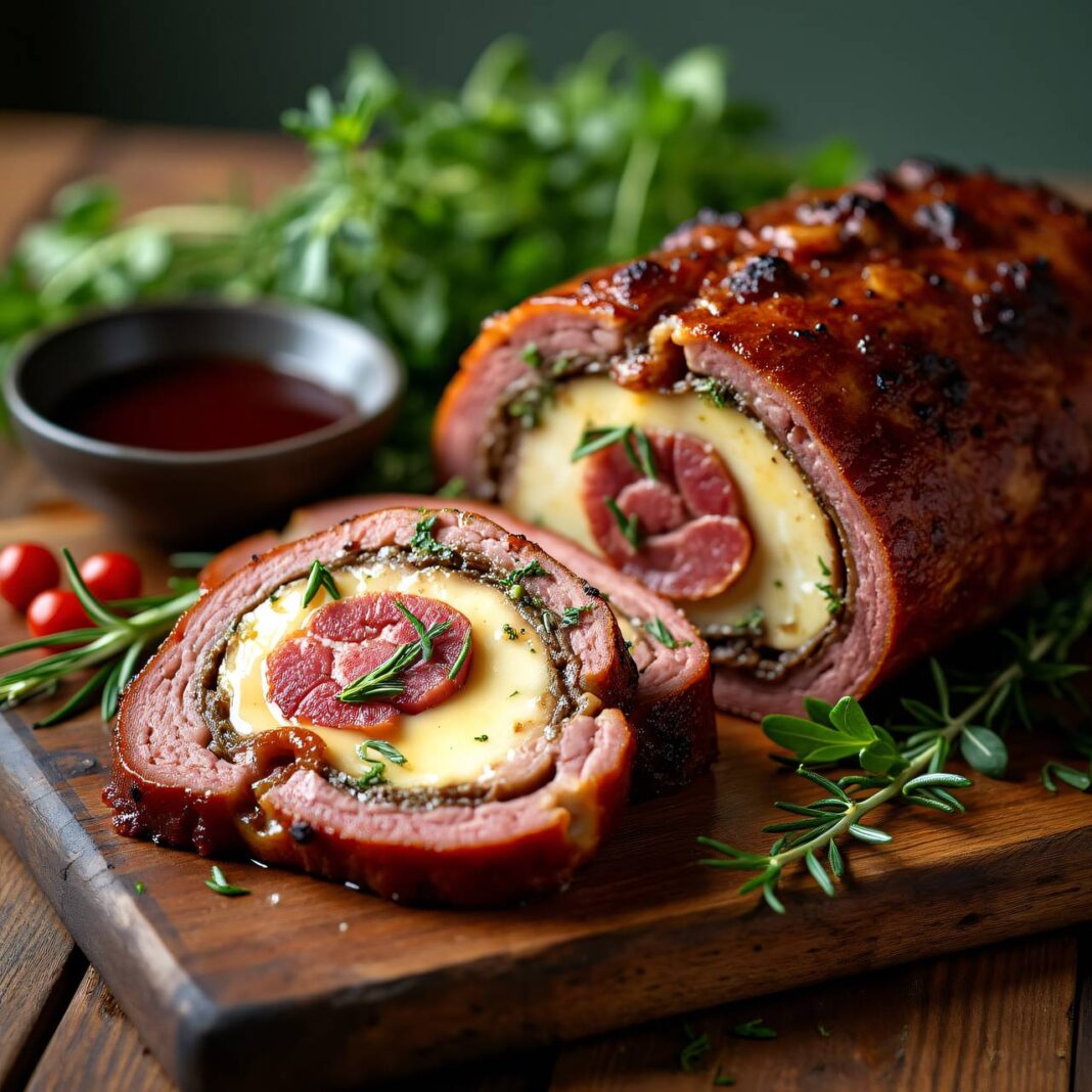 Ein klassischer Sonntagsbraten mit einer herzhaften Füllung aus Rohschinken, Käse und Kräutern, serviert mit einer köstlichen Sauce.