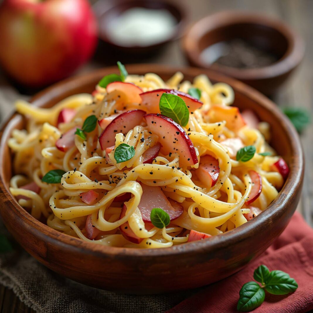Eine herzhaft-köstliche Spätzlipfanne mit Rippli oder Schinken, Weiß- und Rotkraut sowie frischen Apfelscheiben.