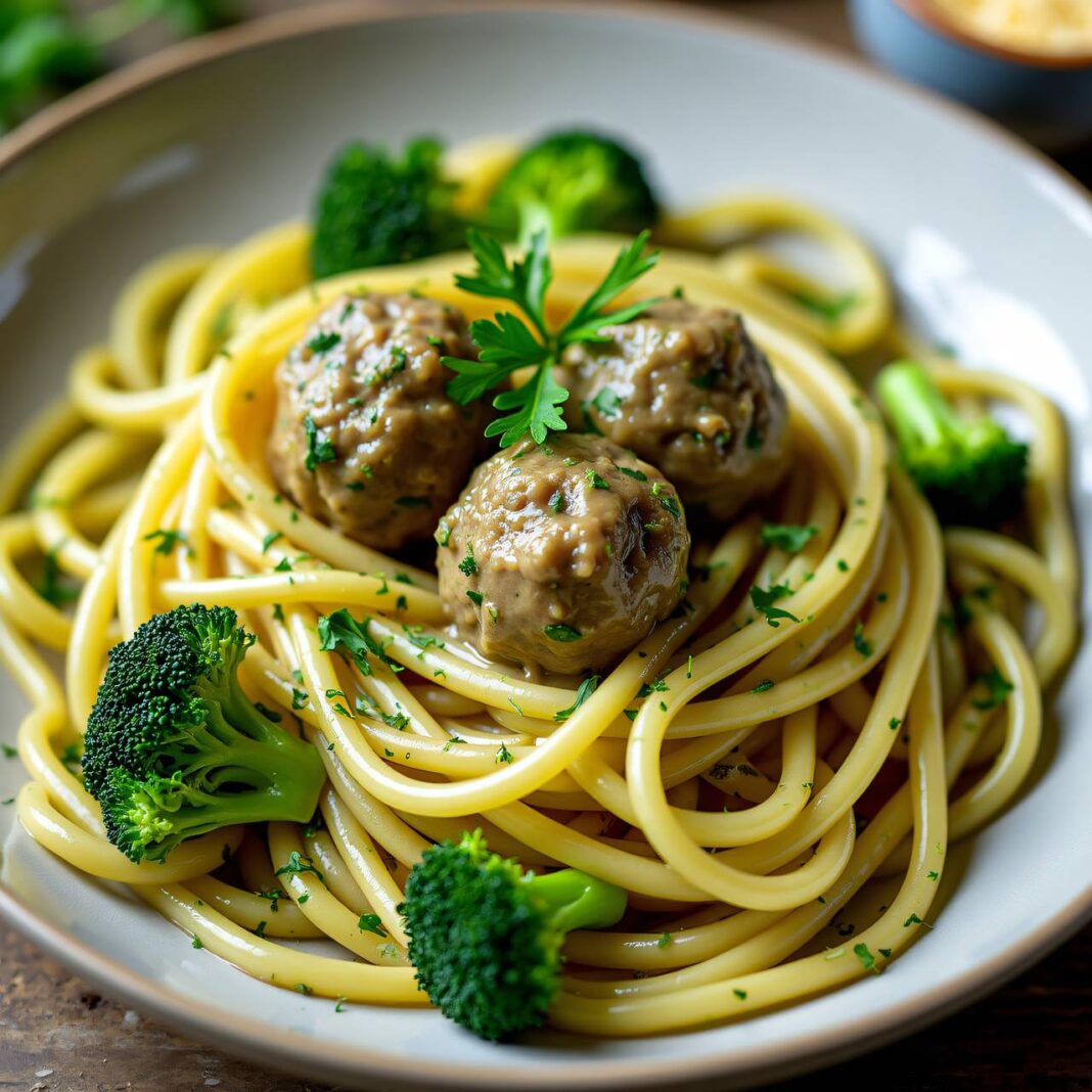 Ein köstliches Rezept für Spaghetti mit saftigen grünen Bällchen aus Kalbsbrät, serviert mit Brokkoli und einer cremigen Sauce.