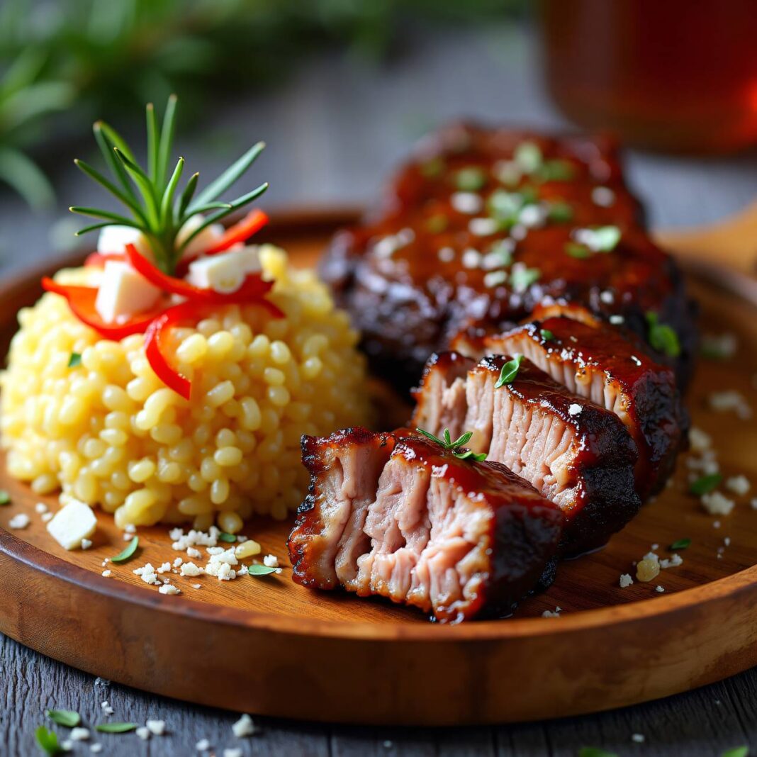 Leckere Spareribs mariniert mit einer Honig-Glasur, serviert mit einem cremigen Risotto.