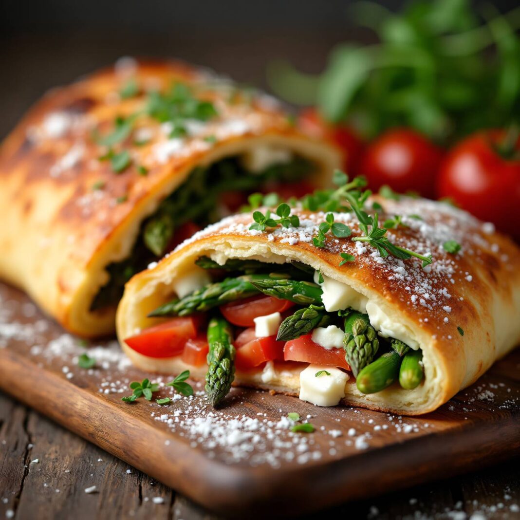 Eine köstliche Calzone gefüllt mit frischem Spargel, Tomaten und Mozzarella.