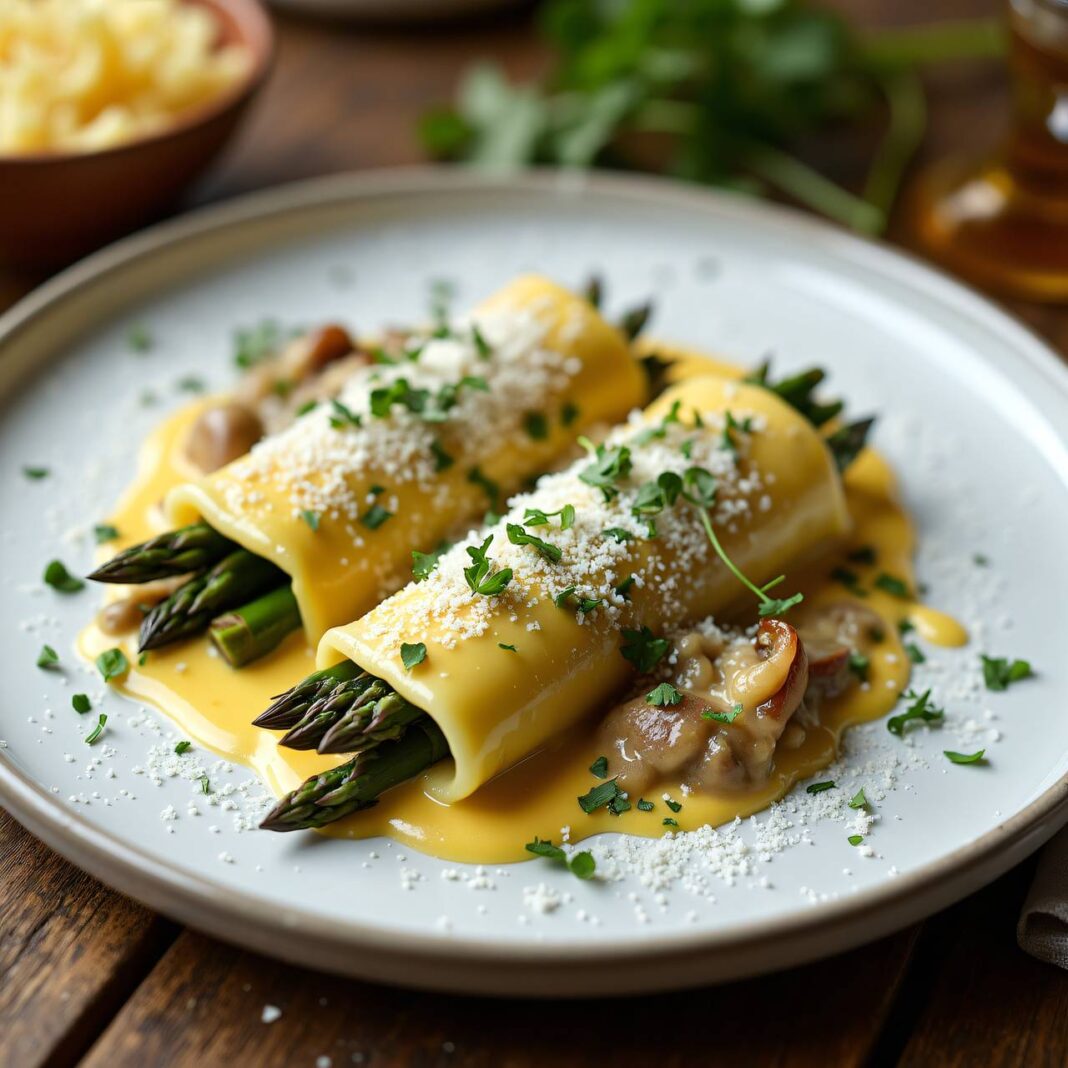 Ein delikates Rezept für Spargel-Cannelloni gefüllt mit frischen Morcheln und einer cremigen Käsesauce.