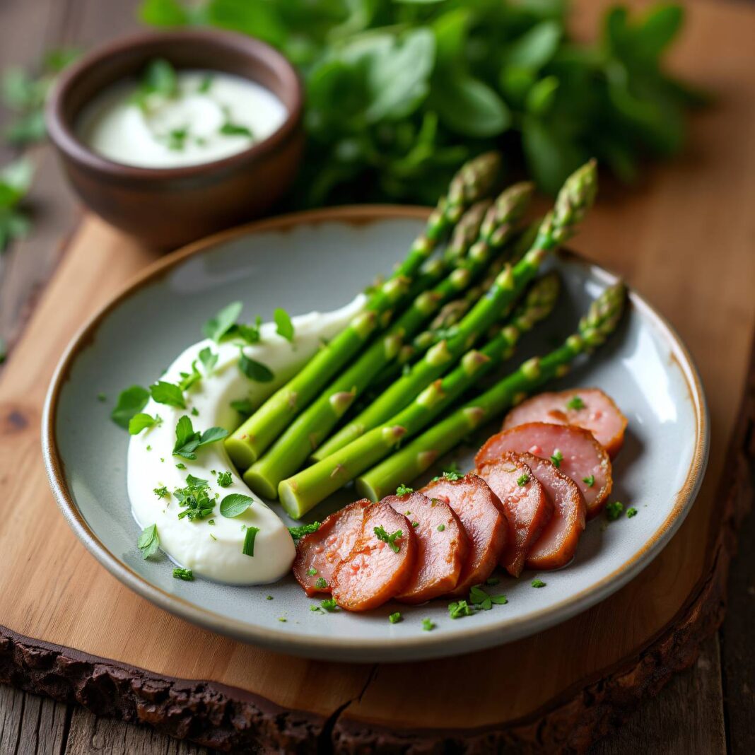 Ein köstliches Gericht aus frischem Spargel, zarten Bratenscheiben und einem erfrischenden Kräuterjoghurt.