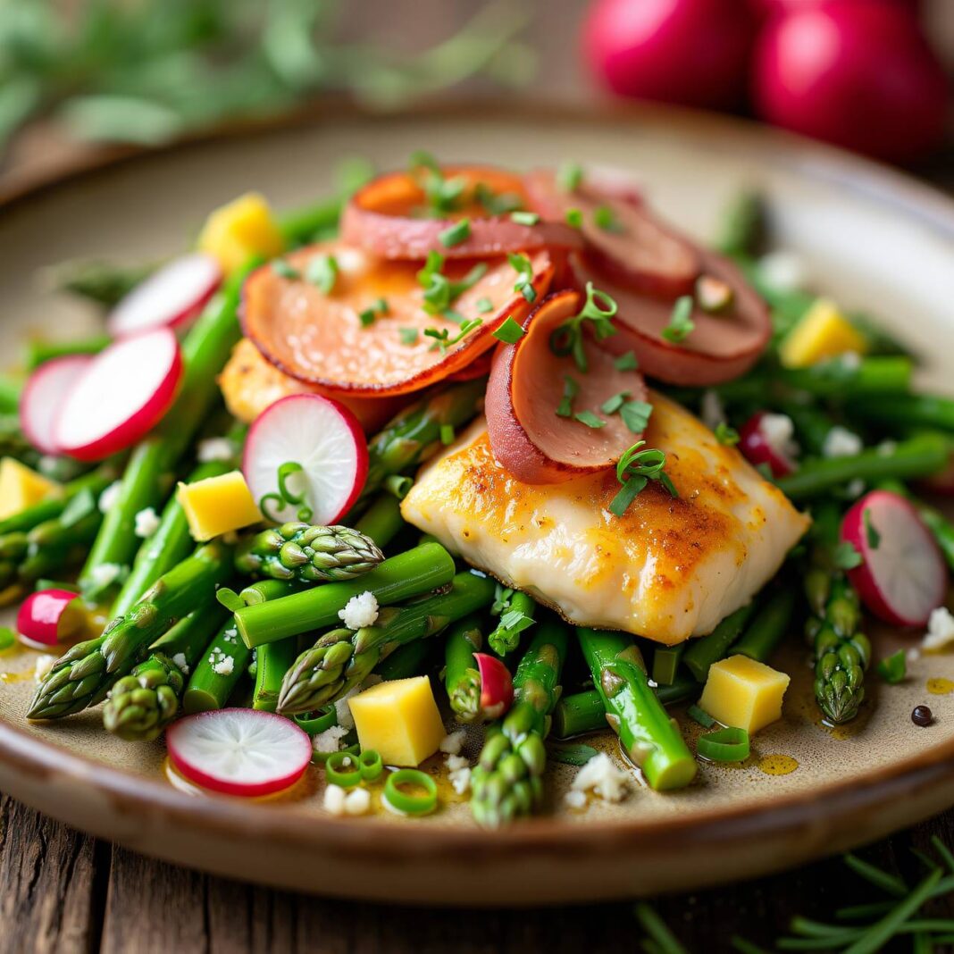 Ein frischer Spargelsalat kombiniert mit gebratenen Fischfilets, serviert mit einer köstlichen Vinaigrette.