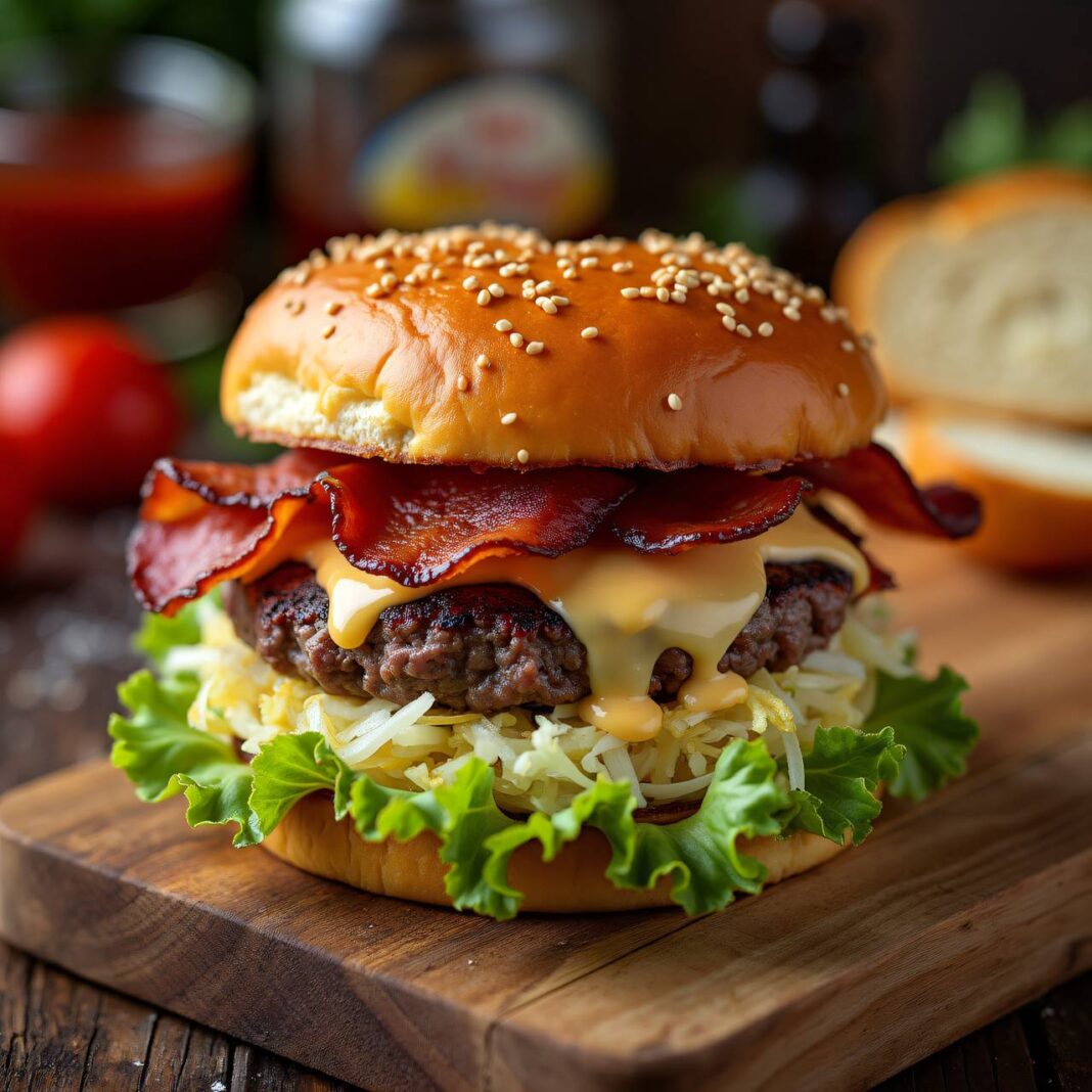Ein herzhaftes Burger-Rezept mit Rinderpattys, knusprigem Speck und Sauerkraut, serviert auf frischen Semmeln.