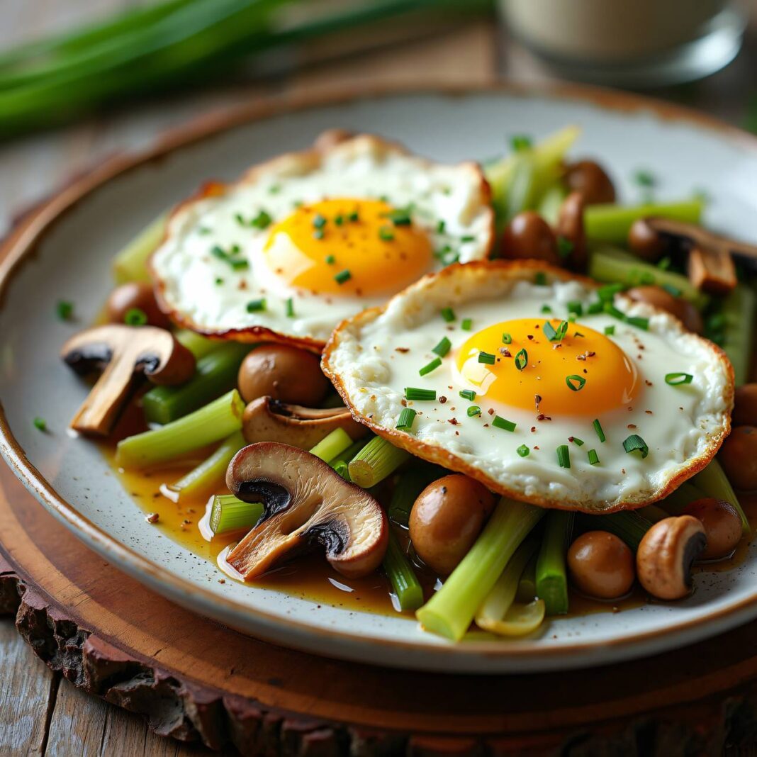 Ein köstliches Low Carb Rezept mit Eierschwämmli und Spiegeleiern, serviert auf einem Bett aus Lauch.