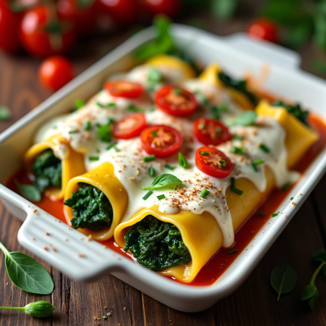Ein köstliches Rezept für gefüllte Cannelloni mit Spinat und Paprika, überbacken mit einer cremigen Sauce.