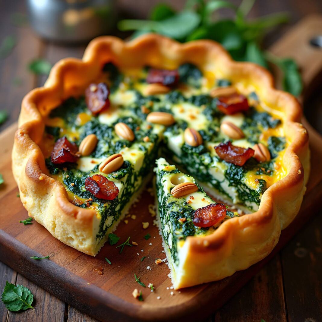 Eine köstliche Spinat-Quiche mit Feta und Speck, ideal für ein herzhaftes Mittagessen oder Abendessen.