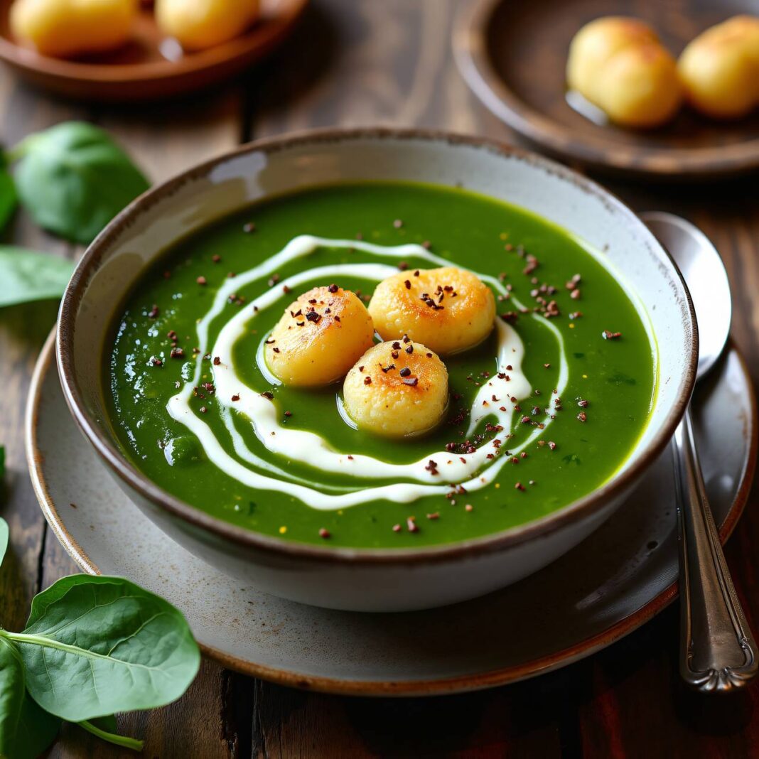 Eine köstliche Spinatsuppe mit zarten Grießnockerln, perfekt für kalte Tage.