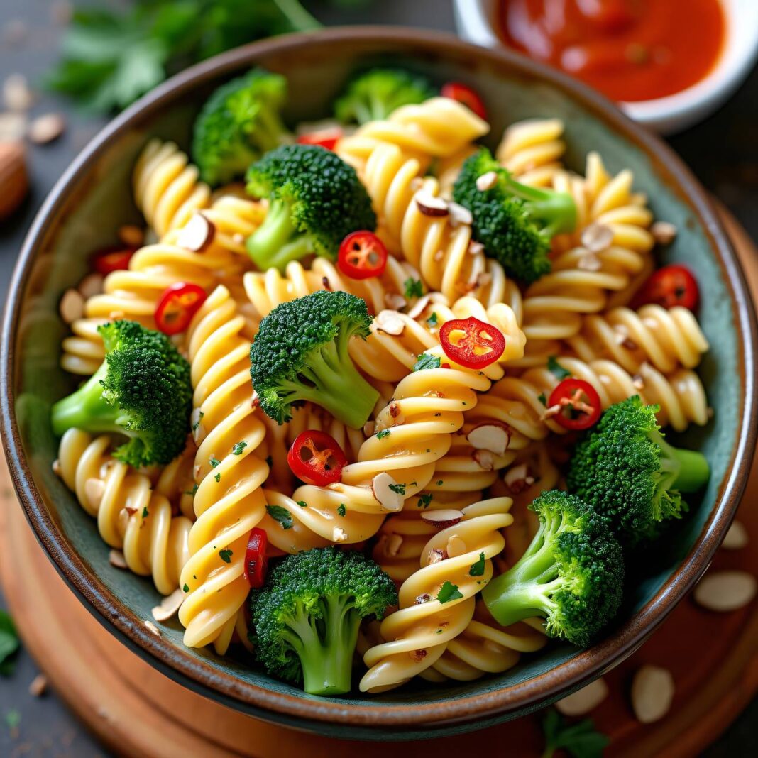 Ein köstlicher Spiralensalat mit einer pikanten Mandelsauce, ideal als Beilage oder Hauptgericht.