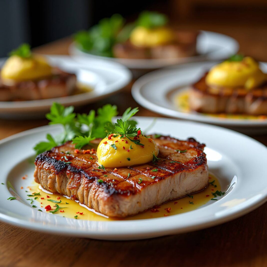 Ein köstliches Rezept für perfekt gebratene Schweinssteaks mit einer würzigen Senfbutter.