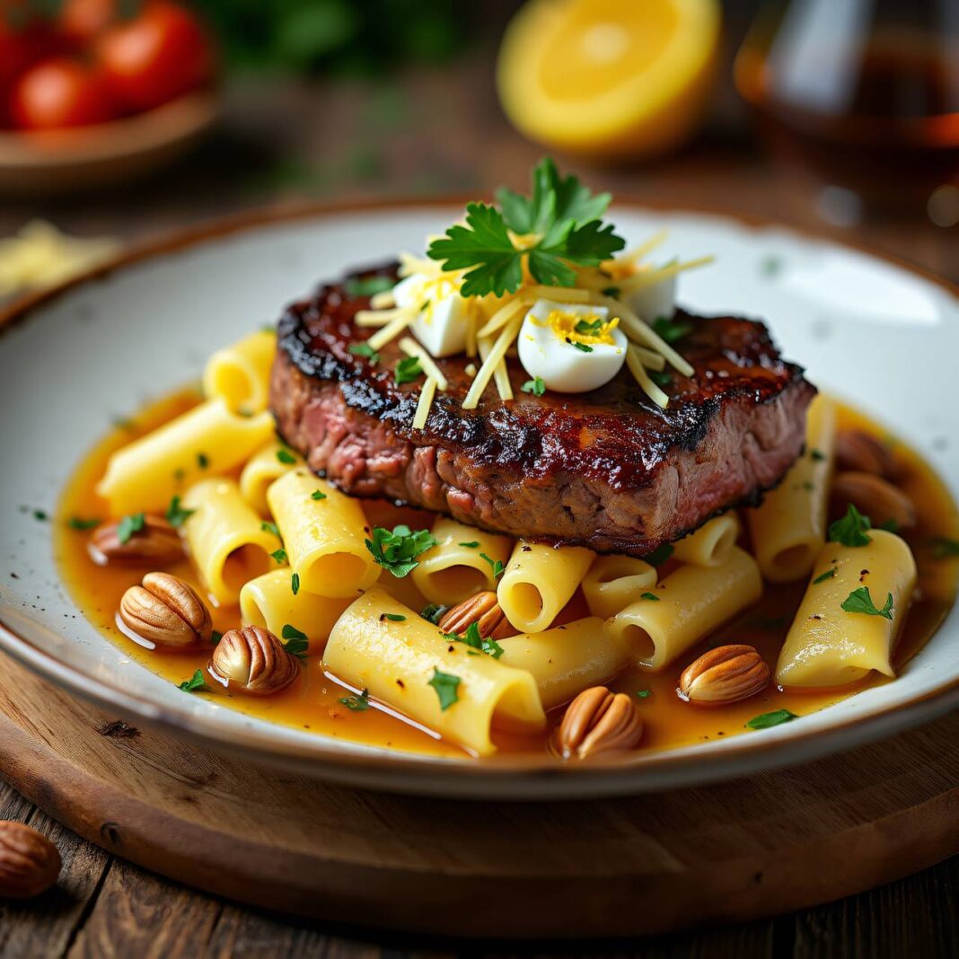 - Anrichten: Schneide die Steaks in Scheiben. Richte die Nudeln in den vorgewärmten Tellern an, lege die Steakstücke und die gewürfelten Eier darauf. Serviere das Gericht mit geriebenem Sbrinz.