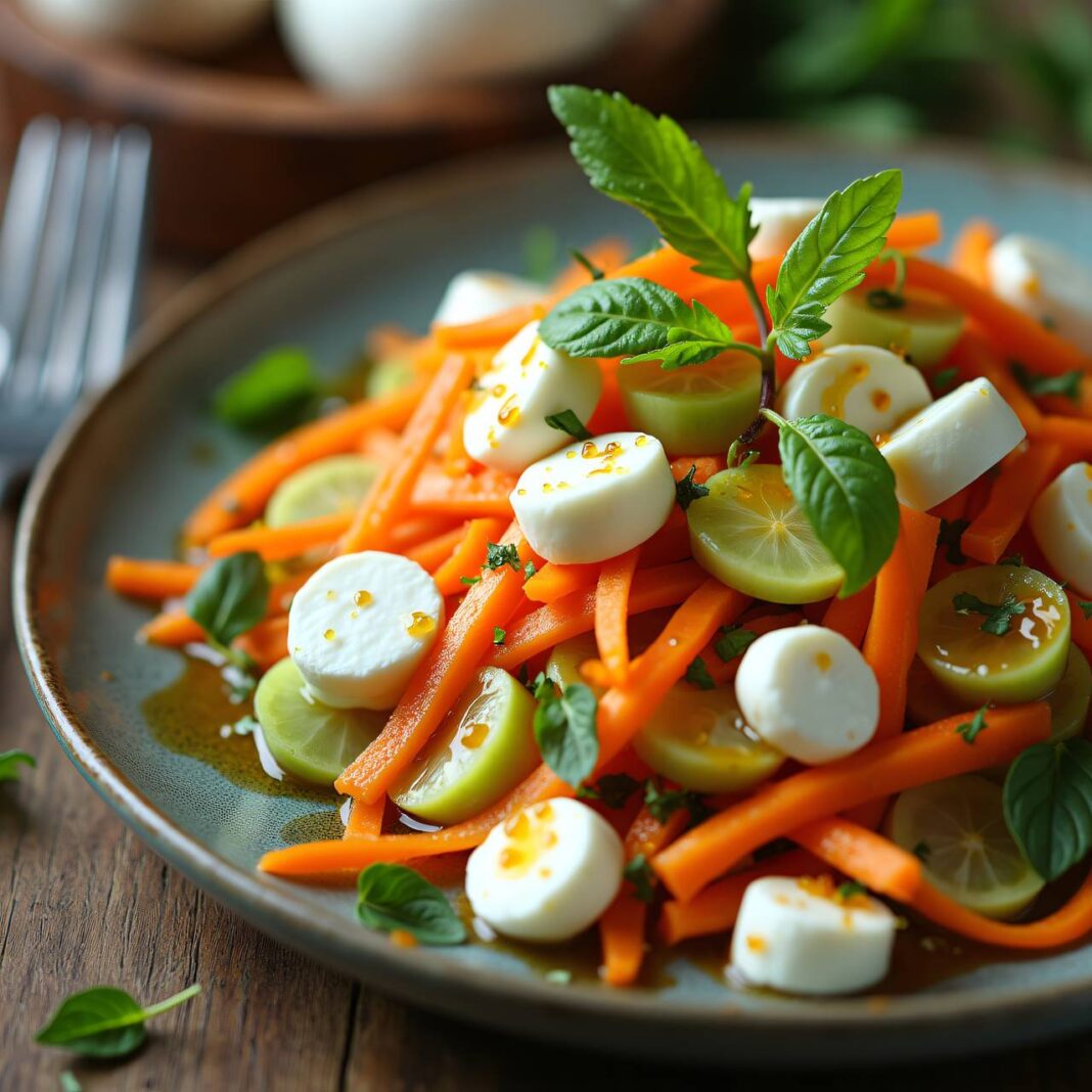 Ein erfrischender und gesunder Salat aus Kohlrabi und Karotten, verfeinert mit Mozzarella und einer süß-sauren Sauce.