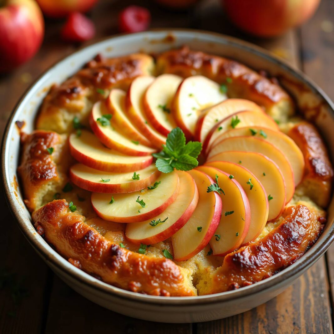 Ein köstlicher Herbstauflauf mit Äpfeln, Striezel und Mandeln, perfekt für die kühle Jahreszeit.