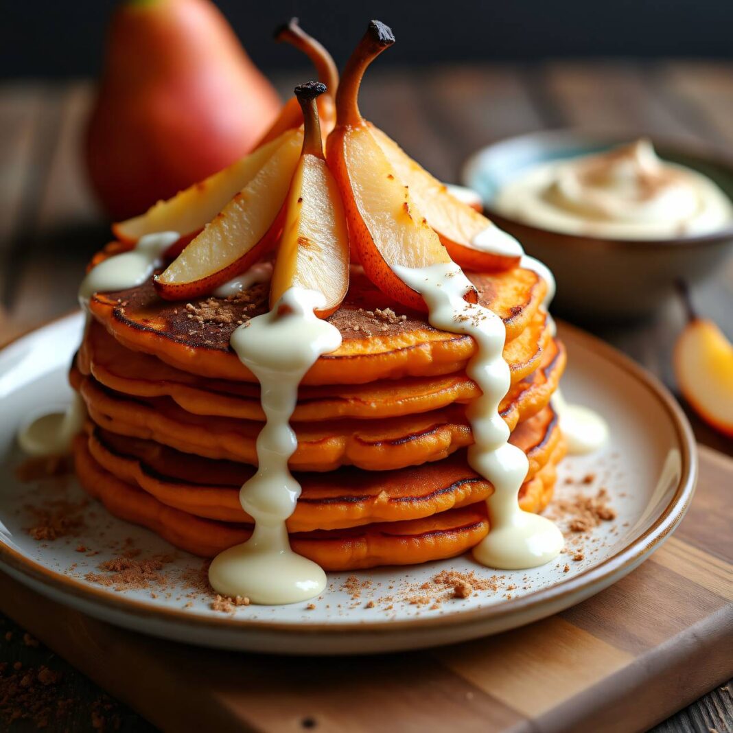 Leckere Pancakes aus Süßkartoffeln, serviert mit einer cremigen Zimtcreme und frischen Birnenscheiben.
