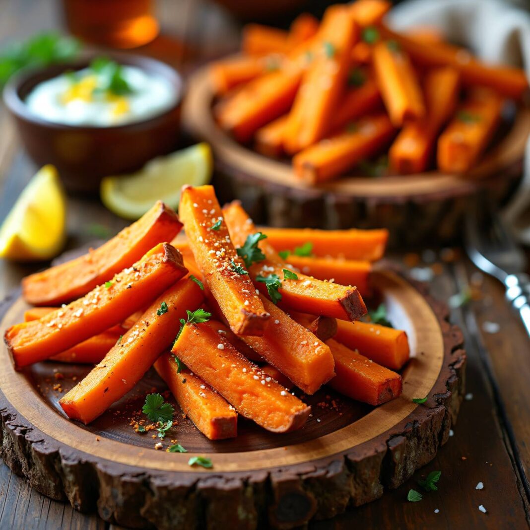 Knusprige Süßkartoffel-Pommes, serviert mit einem erfrischenden Sauerrahm-Dip.
