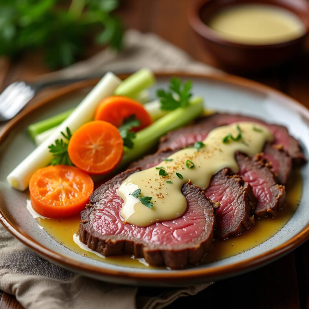 Ein traditionelles Rezept für Tafelspitz, serviert mit einer cremigen Meerrettich-Butter-Sauce und frischem Gemüse.