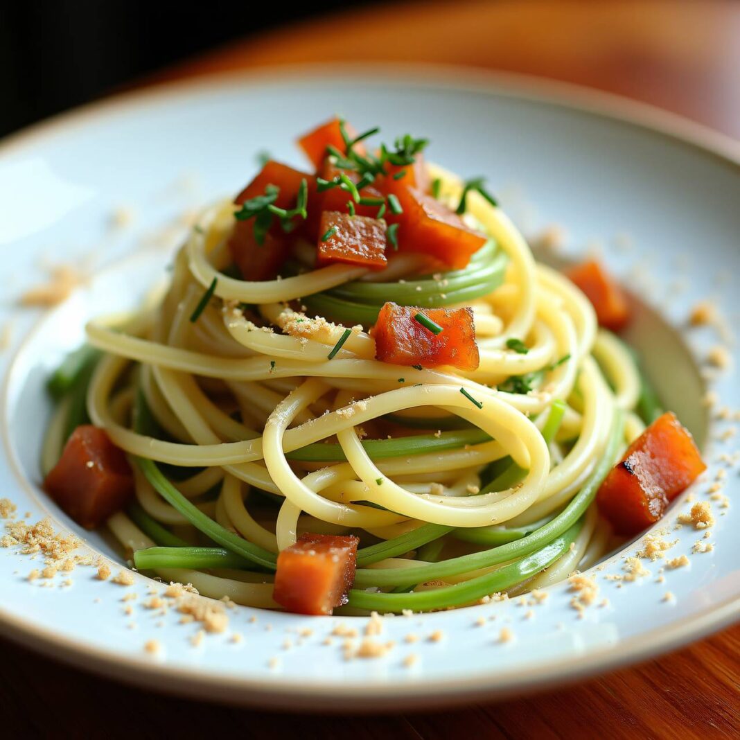 Ein leckeres Rezept für Taglierini mit Frühlingszwiebeln, cremigem Frischkäse und zartem Rohschinken.