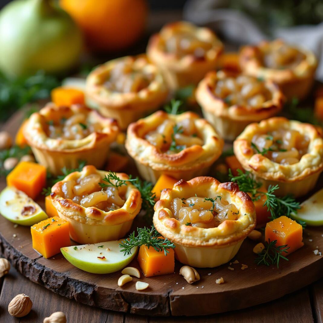 Leckere Tartelettes gefüllt mit einer Mischung aus Sauerkraut und Käse, serviert mit gedämpftem Herbstgemüse.