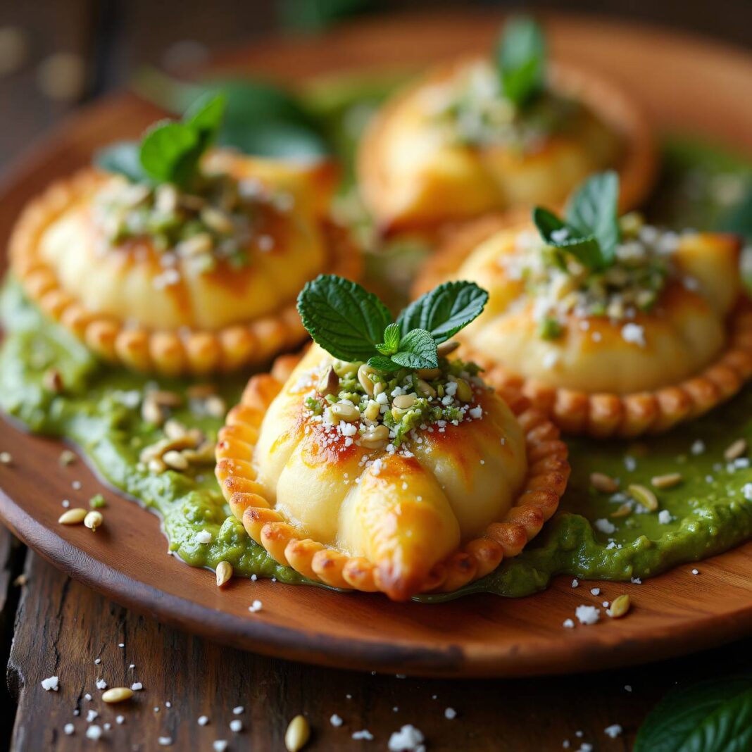 Leckere Taschen gefüllt mit einer Käsecreme und serviert mit einem aromatischen Rapskernpesto.