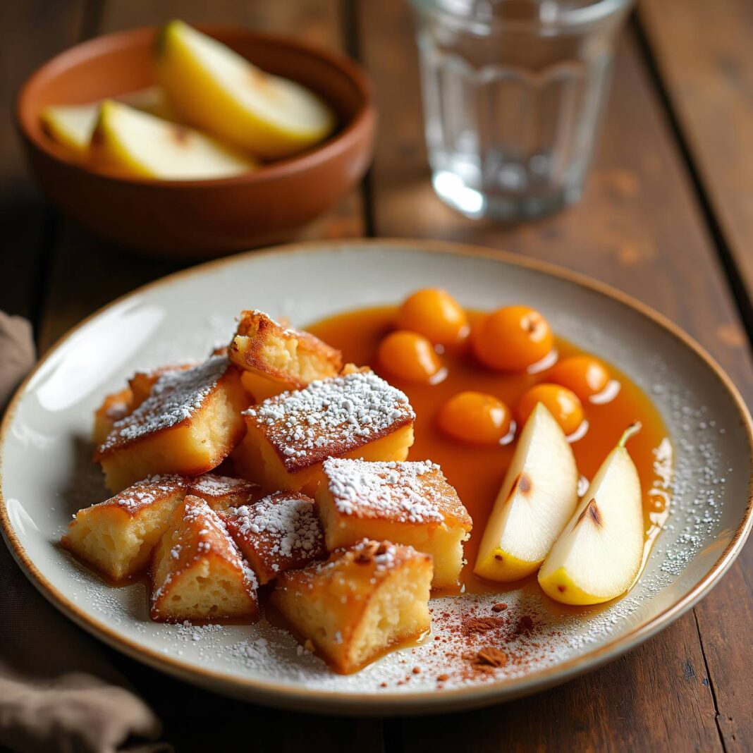 Ein köstlicher Kaiserschmarrn mit saftigen Birnen und einem Hauch von Zimt.