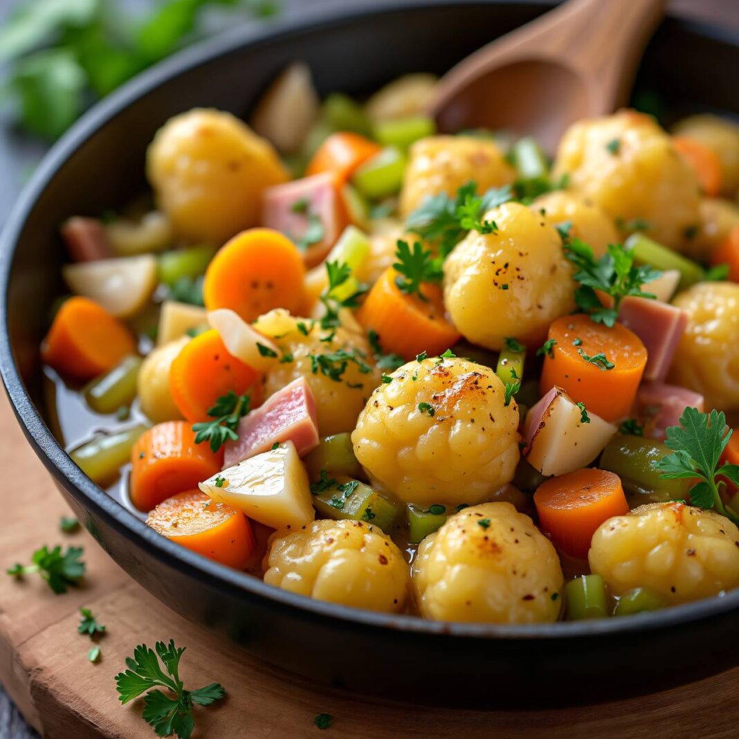 Ein köstliches Gericht mit Knöpfli und einer leckeren Gemüsesauce.