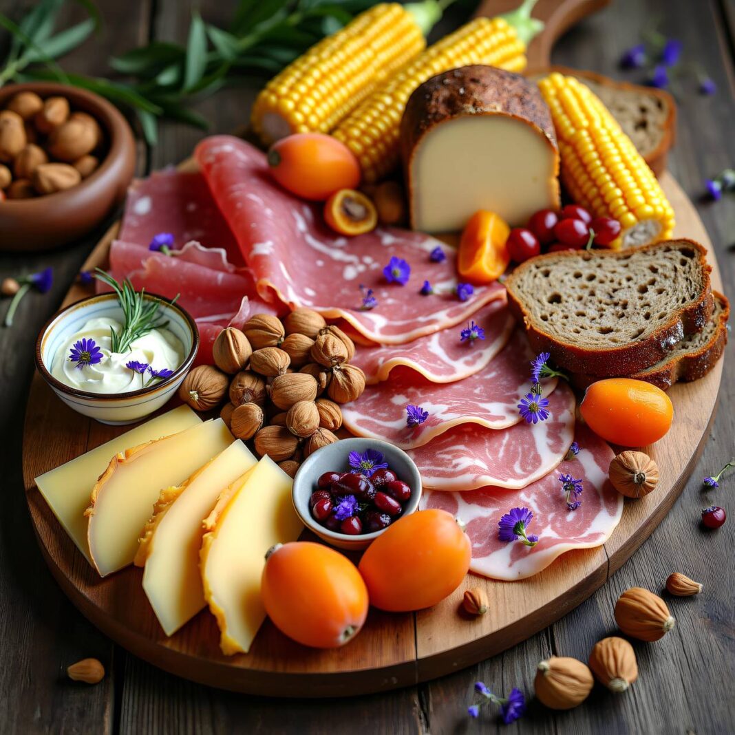 Leckere Häppchen mit Kräuterspeck, Rohschinken, Trockenfleisch und einer köstlichen Blütenbutter.