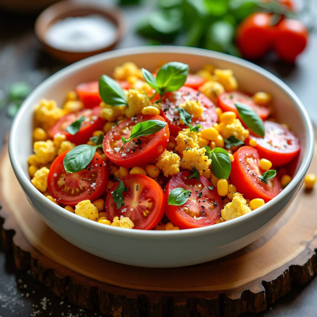 Genießen Sie Ihren frischen Tomaten-Mais-Salat mit einem Hauch von Curry-Popcorn!
