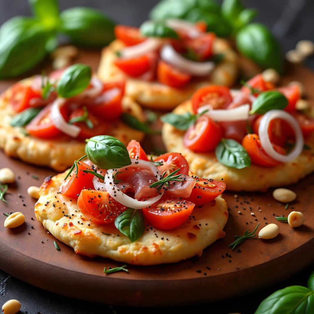 Ein köstlicher Fladen mit frischen Tomaten, Rohschinken und aromatischen Kräutern, perfekt als Snack oder leichtes Hauptgericht.