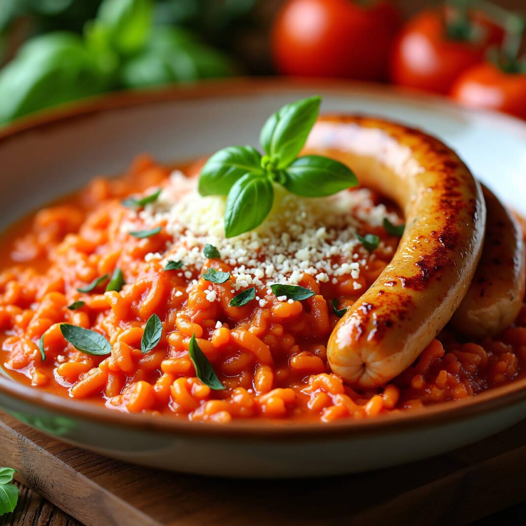 Ein köstliches Tomatenrisotto, verfeinert mit einer Zwiebelmischung und kleinen Zwiebelwürsten.