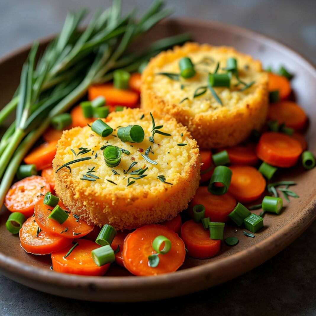 Ein köstliches Gericht aus panierten Tommes in einer aromatischen Rosmarinpanade, serviert mit zarten Karotten.
