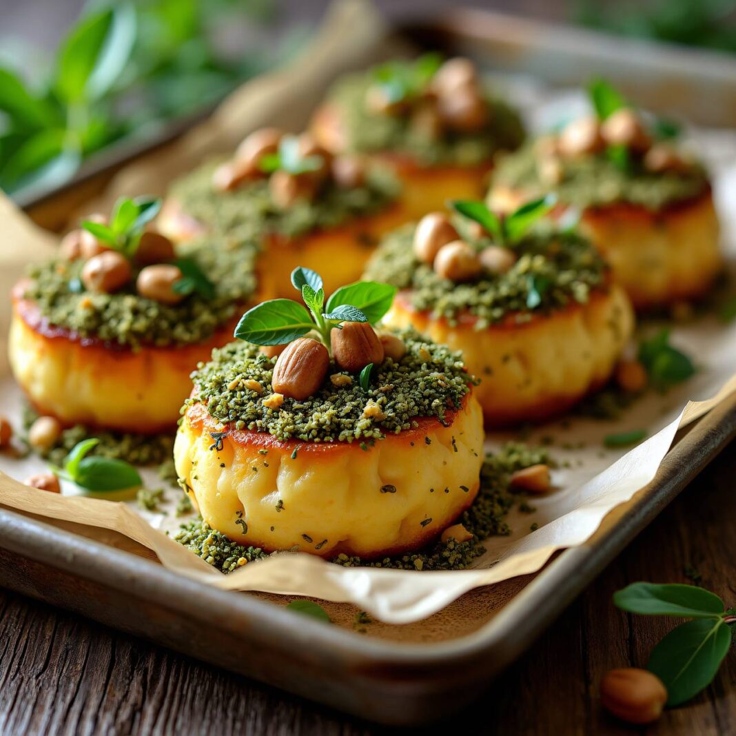 4. Backen Sie die Tommes in der Mitte des vorgeheizten Backrohrs für etwa 10 Minuten, bis die Kräuterhaube goldbraun ist.