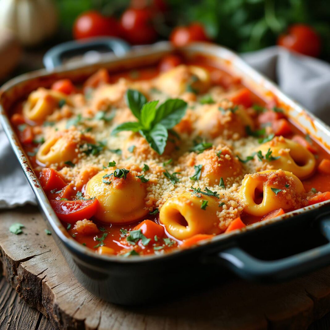 Ein köstlicher Tortellini-Auflauf mit einer leckeren Gemüsesauce und Gruyère-Käse, ideal für ein herzhaftes Abendessen.