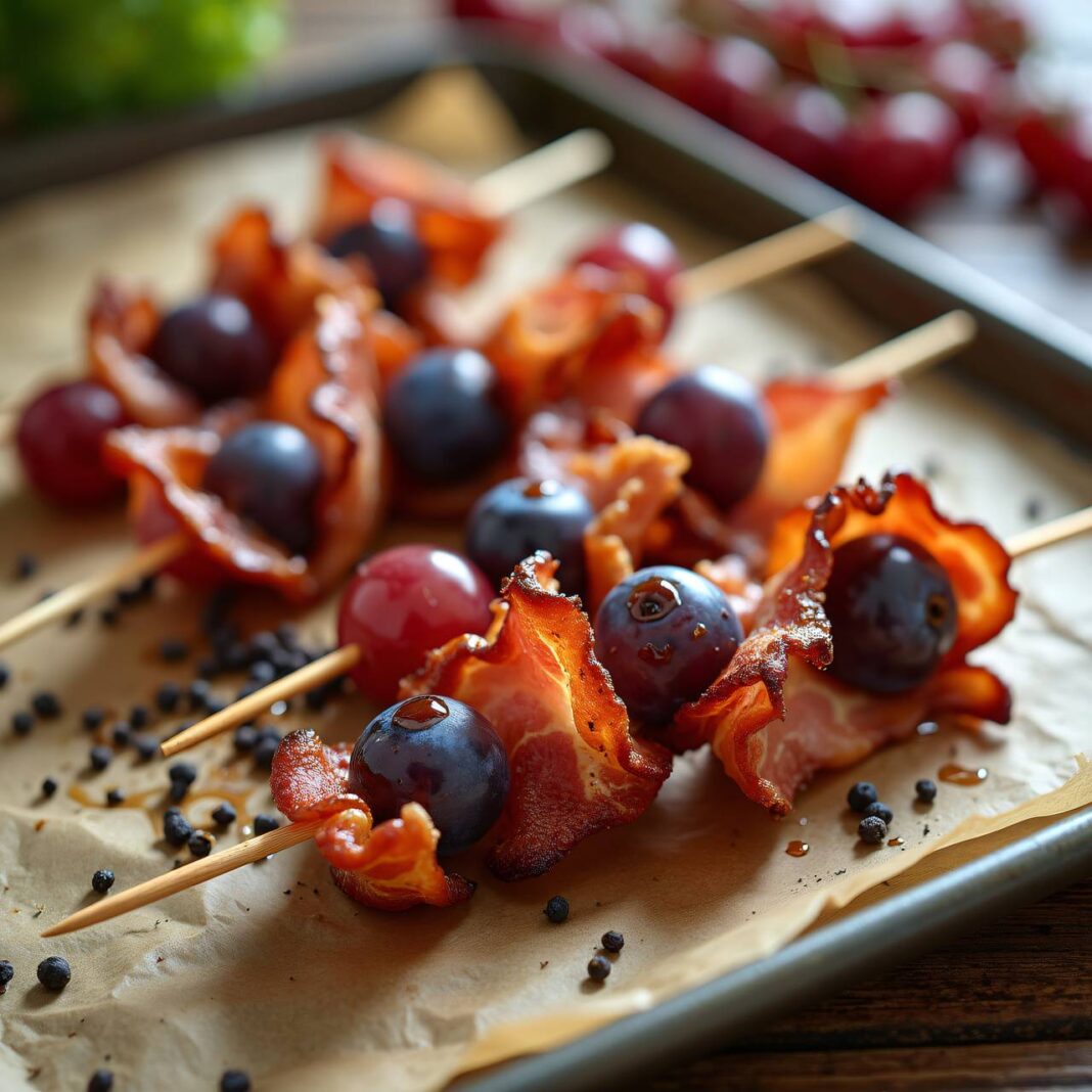 Leckere Trauben-Speck-Sticks, ideal als Fingerfood für Partys oder als Snack.