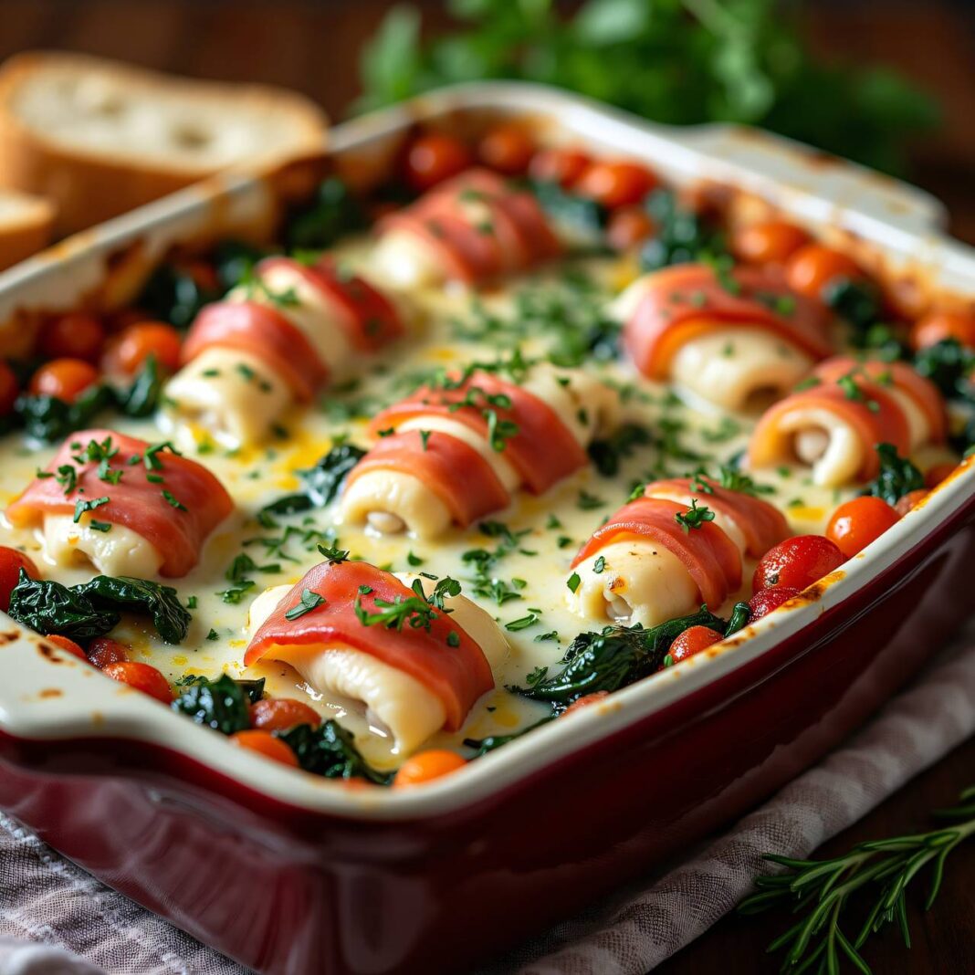 Ein köstliches Rezept für überbackene Krautstiele mit Rohschinken und Hähnchen, ideal als Hauptgericht.