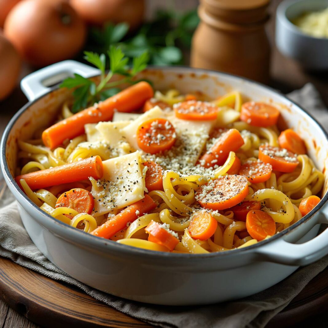 Ein köstliches Gericht mit überbackenen Spätzle, Lauch und Karotten, ideal für ein herzhaftes Abendessen.